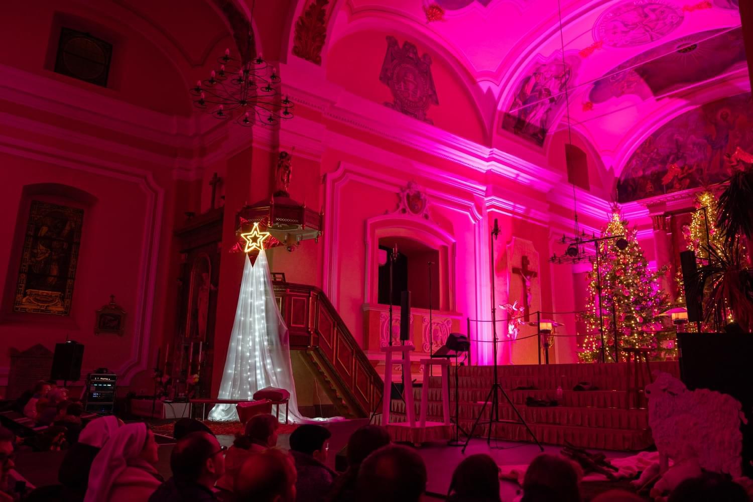 A kétezer éves történet rendhagyó módon egyszer csak átfordult a mába, ahol a gyermekek születésnapi dallal köszöntötték Jézust, majd Regösök érkeztek a Szent családhoz, végül elhangoztak olyan népszerű amerikai slágerek is, mint a Jingle bells és a Rocking around the christmas tree. A közönség a szereplőkkel együtt énekelte a Felis navidad-ot, a Mennyből az angyalt és a Csendes éj közismert dallamait.